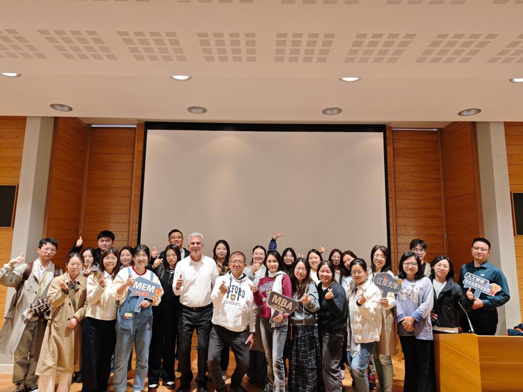 同学们与彼得·辛顿教授合影并赠送商学院礼物