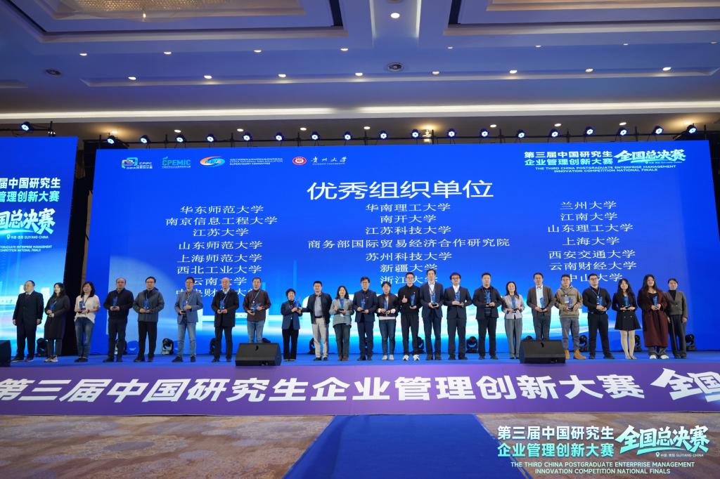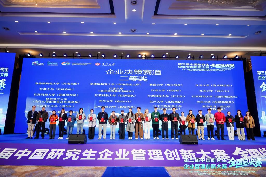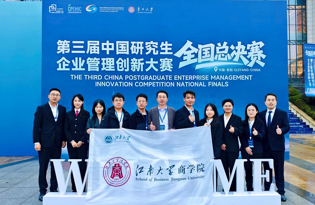 2025年11月7日至9日,第三届(2025)中国研究生企业管理创新大赛全国总决赛在贵阳举行,共有来自全国150所高校的411支队伍晋级全国总决赛。由我校商学院在读研究生组成的三支队伍在总决赛工商管理案例赛道、企业决策赛道中取得佳绩,其中数维破界者(队长:孙海涛,队员:陈柏含、徐雨梅、孙祖清,指导老师:朱晋伟)和经纬纵横队(队长:盛燕春,队员:方俊、吴玉娇,指导老师:刘燕)分别获得工商管理案例赛道二等奖,资本棋手队(队长:高英杰,队员:黄寒松、邱越悦,指导老师:单鹏、唐杰)获得企业决策赛道二等奖,江南大学获得优秀组织奖。