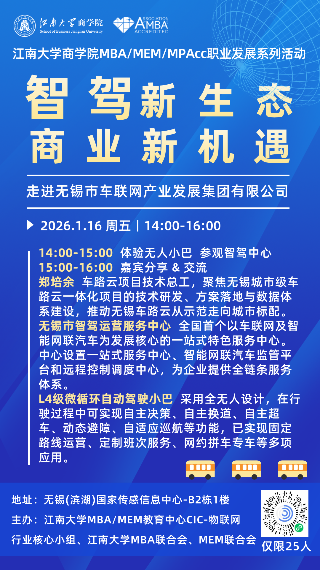 1. 活动主题:江南大学商学院 MBA/MEM/MPAcc 职业发展系列活动之智驾新生态 商业新机遇——走进无锡市车联网产业发展集团有限公司